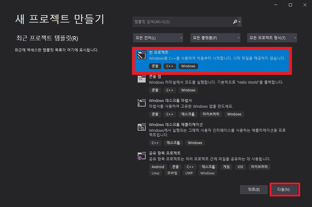 새 프로젝트는 "빈 프로젝트"의 템플릿을 선택하고 "다음"버튼을 눌러줍니다.