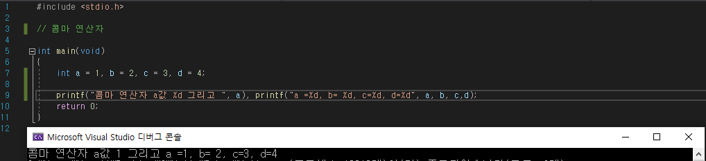 변수를 선언할때 콤마 연산자를 활용해서 한줄에 여러개의 변수를 이어서 선언할 수 있고 printf 또한 이어서 사용이 가능하게 하고 printf 속에서도 여러개의 인자를 넘길때 사용되기도 합니다.