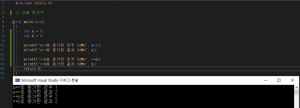 결과를 보면 a++로 증가시킨 첫번째 10라인에서의 출력은 1이지만 다음 printf를 통해서 출력한 a의 값은 2가 출력되어있는 것을 확인할 수 있습니다. ++b는 두개의 결과 모두 2로 동일한 것을 볼 수 있습니다.