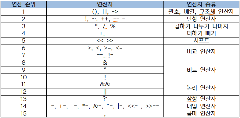 연산자의 우선순위는 괄호와 배열 연산자가 가장 우선되고 그 뒤로는 피연산자의 개수에 따라서 연산우선순위가 높은것을 확인할 수 있습니다. 단항 연산자 - > 이항 연산자 -> 삼항 연산자 순서로 볼 수 있고 이항 연산자에서도 곱하기와 나누기가 더하기 빼기보다 우선순위가 높은 것을 확인하실 수 있습니다.