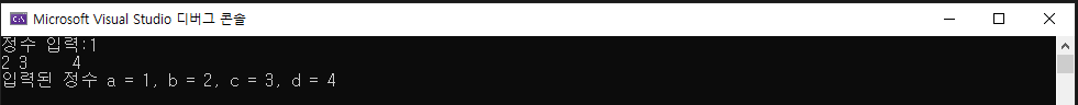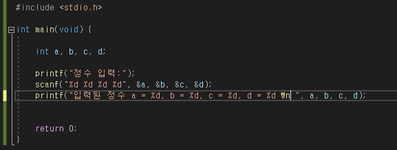 printf("입력된 정수 a = %d, b = %d, c = %d, d = %d \n ", a, b, c, d);