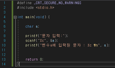 scanf를 활용한 문자 입력은 수식문자 %c로 입력받고 %c로 출력하는 방식으로 사용할 수 있습니다.