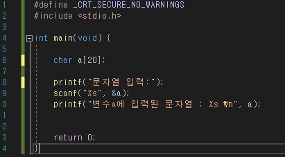 printf("변수a에 입력된 문자열 : %s \n", a);