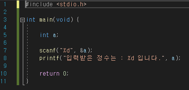 scanf로 정수를 입력받기 위해서는 어떻게 해야될까?? scanf 함수의 사용법은 우리가 이전에 사용해왔던 printf 함수의 사용법과 동일한 방법으로 사용되어 집니다. 다만 scanf에서 입력받을 변수를 선언할 때 변수명 앞에 '&'를 같이 붙여줘야 합니다.