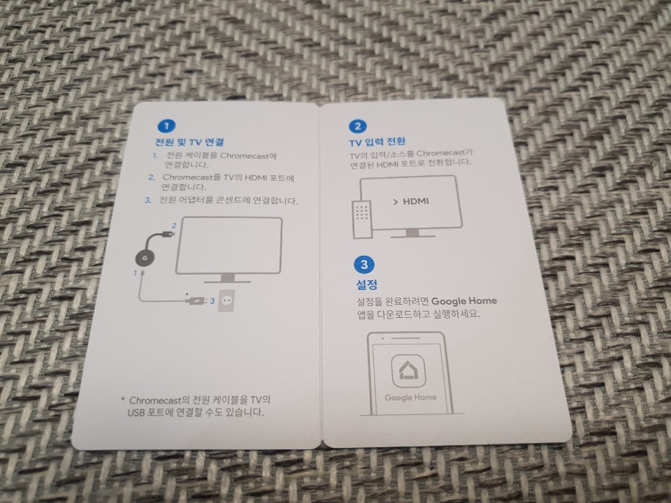 설명서에는 크롬캐스트의 전원 및 TV연결방법과 설정에 대해서 나와있고 설정방법은 google home 앱을 설치하고 실행하면 설치하는 방법을 쉽께 따라하면서 크롬캐스트 연결설정을 하실 수 있습니다.
