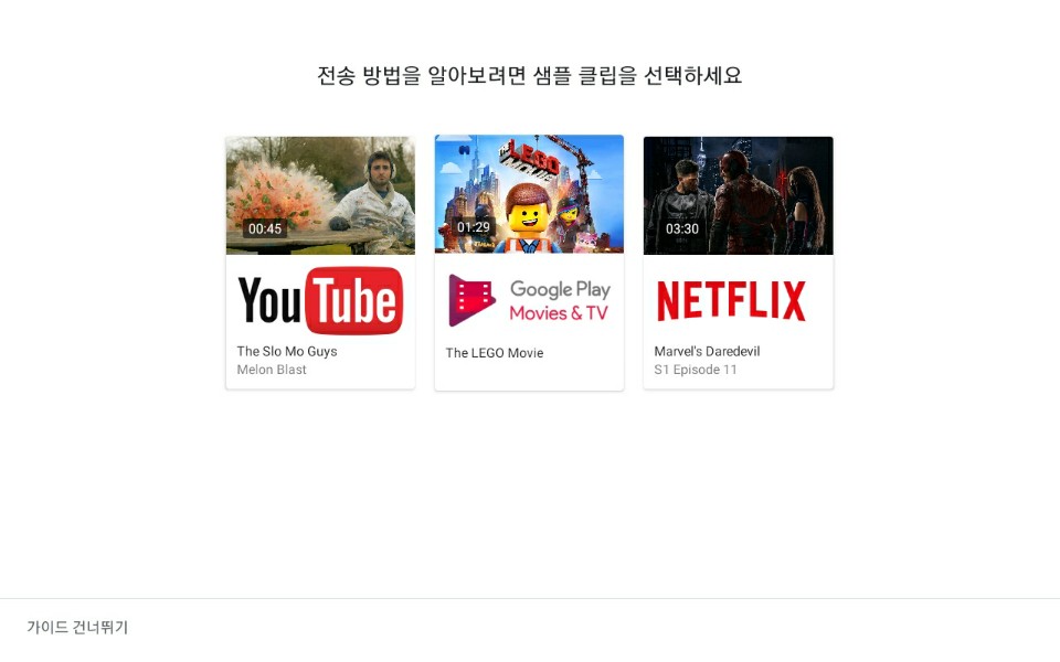 연결설정이 모두 끝나고 youtube와 NETFLIX에 대한 전송법을 알아볼 수 있는 샘플 클립등을 확인하고 사용법을 익힐 수 있습니다.