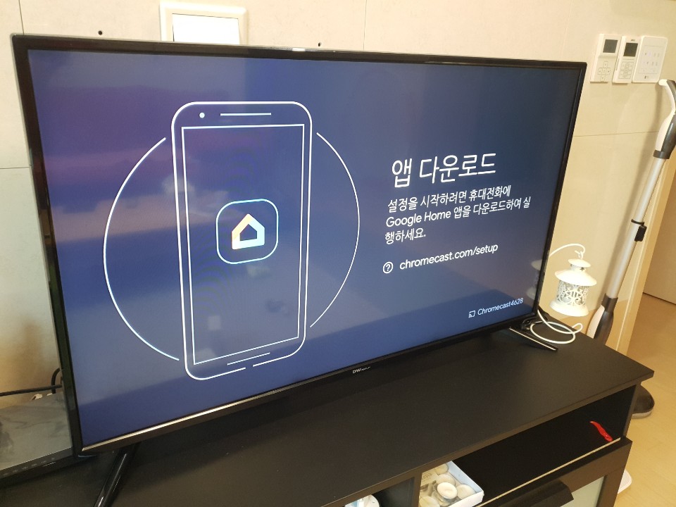 크롬캐스트를 처음 연결하고 크롬캐스트의 HDMI가 연결된 입력으로 화면을 전환하면 "앱 다운로드"하라는 화면이 보여집니다. google home 앱을 다운로드 받고 "시작하기"를 눌러 차근차근 따라가면서 제품을 등록하고 연결설정을 시작해줍니다.