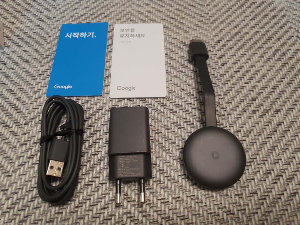 크롬캐스트 3세대의 구성품은 크롬캐스트 본체, 전원케이블, 전원어뎁터, 설명서, 보증서로 구성되어 있습니다. 크롬캐스트는 본체만 TV나 모니터에 연결해야 되는 것이 아니라 전원까지 같이 연결을 해줘야 합니다.