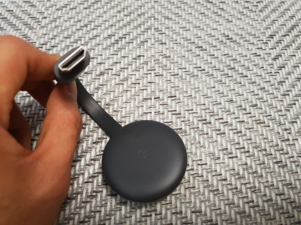 크롬캐스트 머리에 달려있는 선은 TV나 모니터에 연결 할 수 있는 HDMI 케이블이 있고 크롬캐스트의 아래쪽에는 전원케이블을 연결할 수 있는 케이블 구멍이 있습니다.