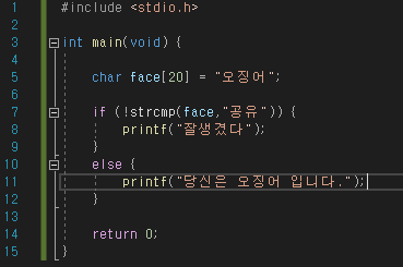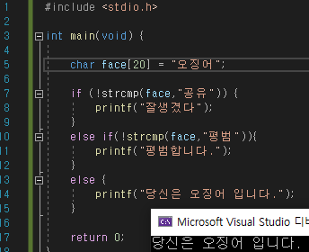 위의 소스코드를 가지고 한번씩 확인 해보는 것도 좋습니다. 위에 소스는 문자열을 비교하는 실행문이지만 if ~ else if ~ else 의 동작이 어떻게 되는지 까지만 확인하고 넘어가줍니다. 문자열의 비교는 !strcmp("오징어","오징어") <<와 같은 식으로 작성합니다.