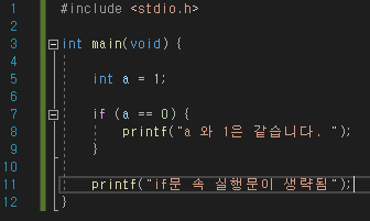 두번째 소스에서의 조건문은 "변수 a가 0이 같으면"이라고 제시하고 있지만 a와 0이 다르기 때문에 if문속 실행문이 실행되지 않고 건너뛰게 되어 아랫줄의 "if문 속 실행문이 생략됨"의 문구가 표시되어지게 됩니다.