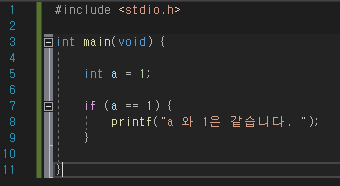 위에 소스코드2개를 보면 모두 변수 a의 값을 1로 초기화 했습니다. 먼저 왼쪽에 있는 소스코드를 보겠습니다. 왼쪽에는 "변수 a가 1과 같으면" 이라는 조건을 제시하고 해당 조건이 맞다면 실행문에 있는 printf 함수가 실행되어 실행된 화면에는 "a 와 1은 같습니다." 라는 문구가 표시되게 됩니다.