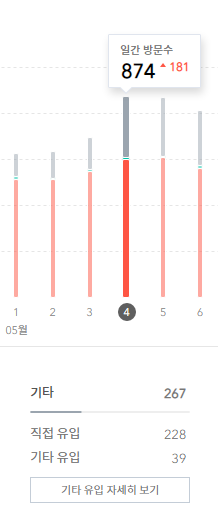 티스토리 구독, 댓글 활동으로 들어오는 방문자는 보통 구글, 다음, 네이버 의 검색유입이 아닌 직접 유입이나 기타 유입으로 들어오는 경우가 많아서 티스토리 블로그의 구독, 댓글 활동을 하는 날에는 직접유입이 많았습니다. 5월달의 방문자수는 2,060명 정도 증가 했지만 사실상 구독활동을 하러 다니면서 유입된 방문자 수를 제외 한다면 4월달과 크게 다르지 않은 방문자 수 였을 것으로 생각됩니다.