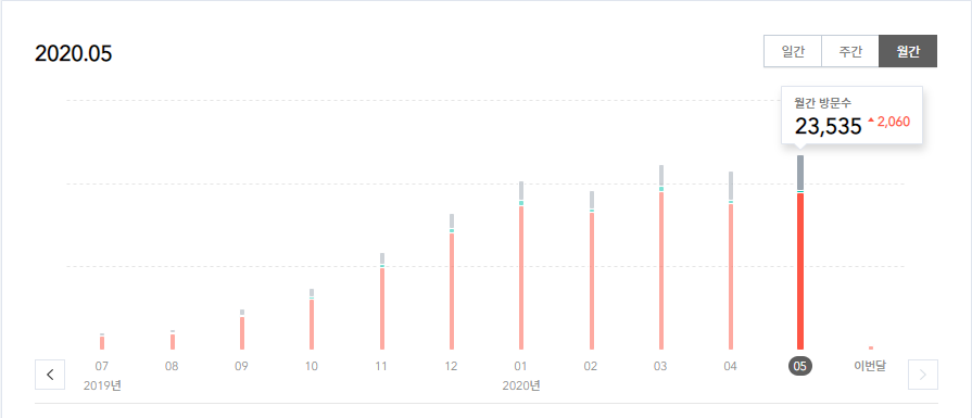 5월달에는 4월달에 비해서 2,060명 증가한 23,535명의 방문자수를 기록했습니다. 4월달에는 관리를 잘 못해 3월달 보다 방문자수가 조금 떨어지는 모습을 보였는데 5월에는 3월 22,272명보다 더 많은 방문자수를 보여줬습니다. 지금 티스토리 블로그는 구글에서의 유입이 가장 대표적이고 네이버와 다음에서의 방문자수는 많이 낮은 상태입니다.