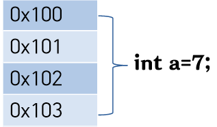 위에 "홍지대학교"를 만들면서 할당받는 땅에는 주소가 있습니다 "서울시 00구 00동 324-1번지"의 주소가 있습니다. 이와 같이 int a를 선언하면서 만들어지는 a의 땅(메모리)에도 주소(0x100)가 있습니다.