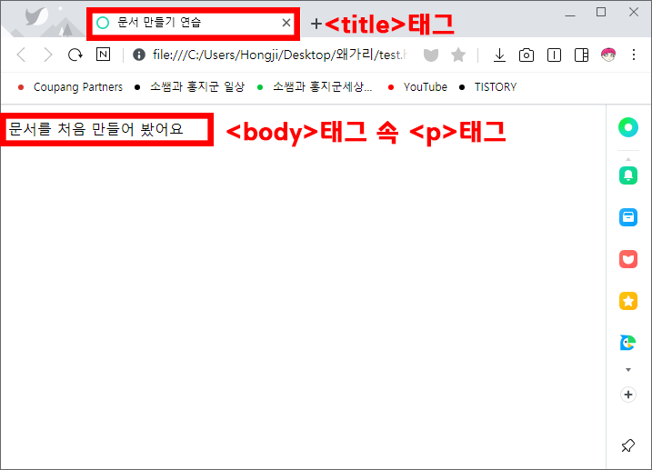 그리고 html 브라우저 속에는 "문서를 처음 만들어 봤어요" 라는 문구가 표시되어집니다!