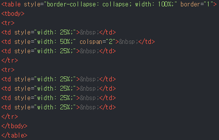 위처럼 1행 3열에 대한 표를 만들고 싶다면 어떻게 소스를 만들면 될까요??