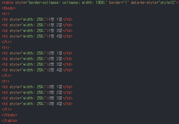 소스코드를 살펴보면 행과 열을 지정했는데 <table>태그 바로 밑에 <tbody> 태그를 시작하는 것을 볼 수 있습니다. <tbody>가 왜 생겼을까??? 1행 1열 부터 3행 4열까지가 <table>태그의 몸통임을 알려주는 것 입니다.