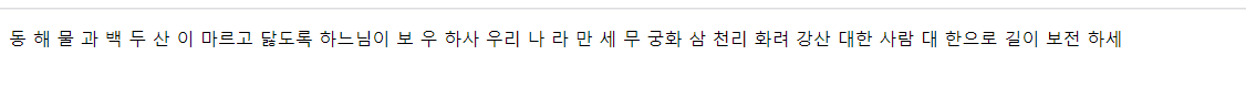 <p> 동해물과 백두산이 마르고 닳도록 하느님이 보우하사 우리나라 만세 무궁화 삼천리 화려강산 대한사람 대한으로 길이 보전하세! </p><br>