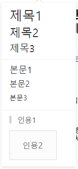 티스토리 블로그 글쓰기의 기능중에서도 인용1, 인용2와 같이 인용을 위한 기능을 제공해줍니다. 인용 2를 누르면 네모난 영역이 생성되는 것을 확인할 수 있습니다.