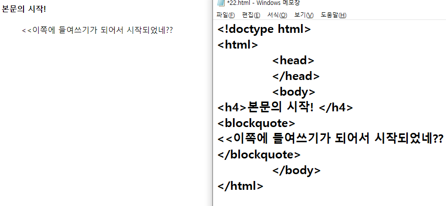 소스코드에는 <blockquote>태그를 시작해 바로 "<<이쪽에 들여쓰기가 되어서 시작되었네??"라고 작성했지만 결과를 보면 본문의 시작! 다음 글에는 들여쓰기가 되어 " <<~~~~"로 보이는 것을 확인하실 수 있습니다.