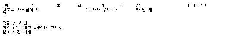 <p> 무궁화 삼천리 화려강산 대한사람 대한으로 길이 보전하세. <p><br>