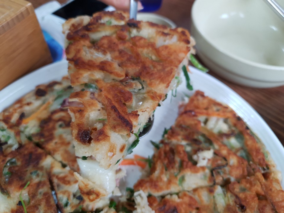인터넷에서 밀싹해물파전이 맛있다고 해서 가장 기대를 많이 했던 "우리밀 밀싹해물파전"은 생각보다 빠르게 나왔습니다. 밀싹해물파전은 두깨가 두툼해서 그런지 바삭한 감이 전혀 없었고 물렁물렁 아직 파전이 덜 익은 것 같은 느낌이 었어요.. 해물 맛을 느끼기 보다는 그냥 식감부터 별로 좋지 않아서 김치랑 같이 먹는 맛으로 먹었네요.