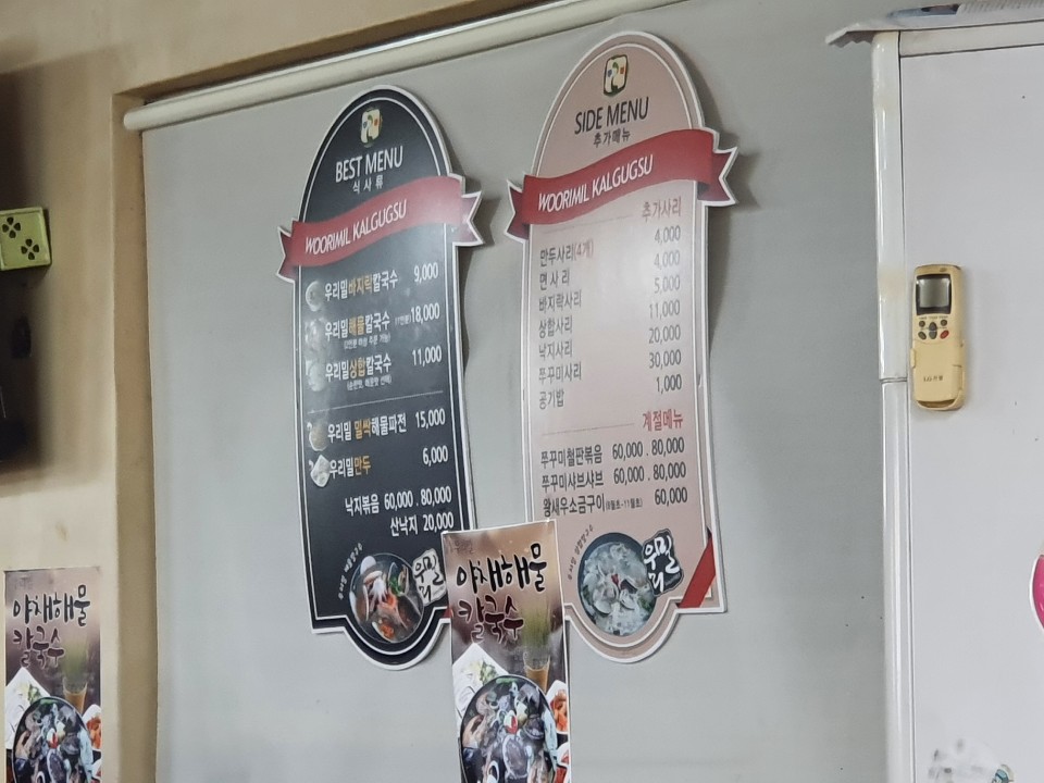 주로 시키는 메뉴는 '"우리밀 바지락 칼국수" or "우리밀 해물 칼국수" + "우리밀 밀싹해물파전" 으로 많이 시켜드시는 것 같네요.