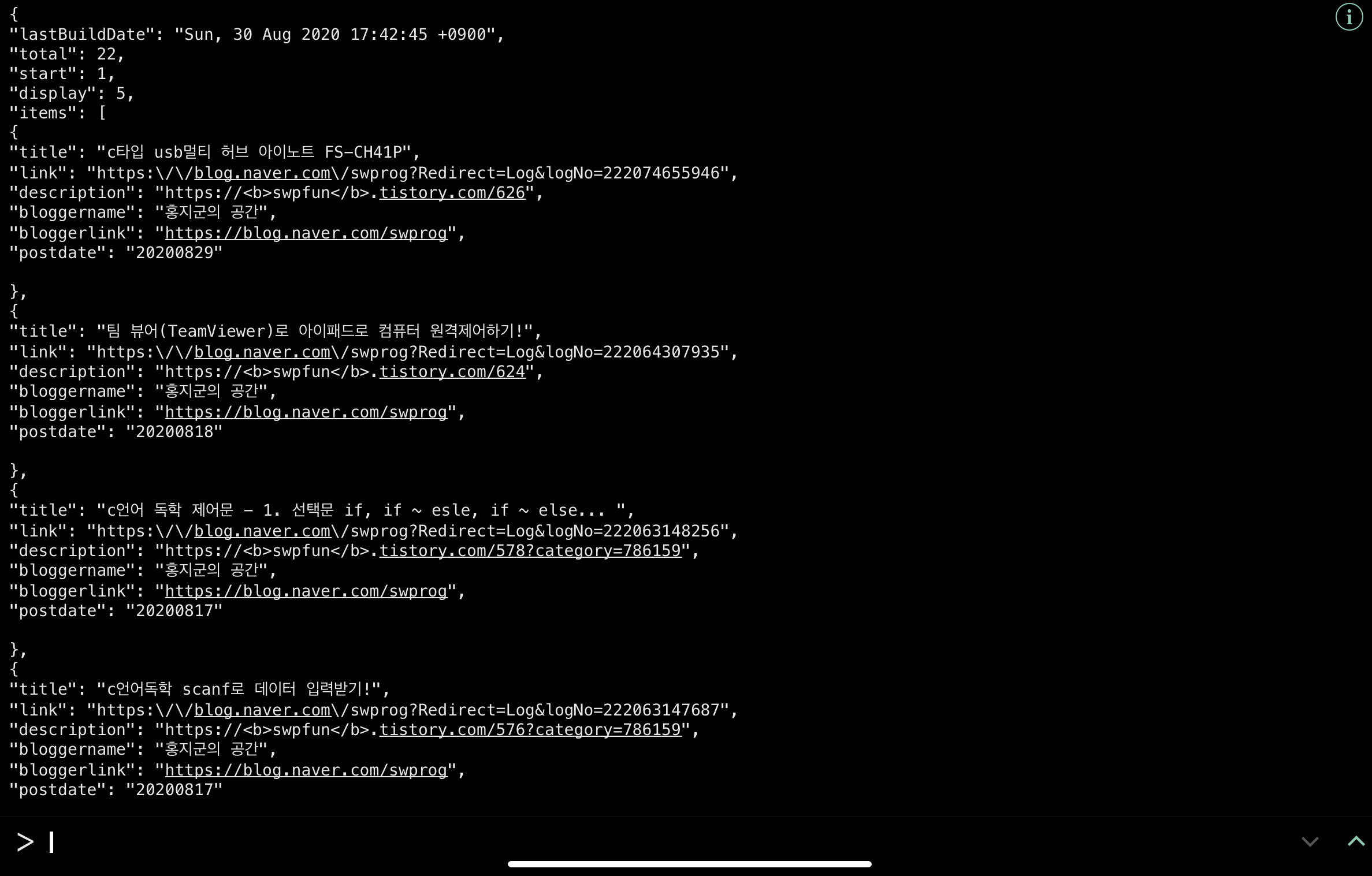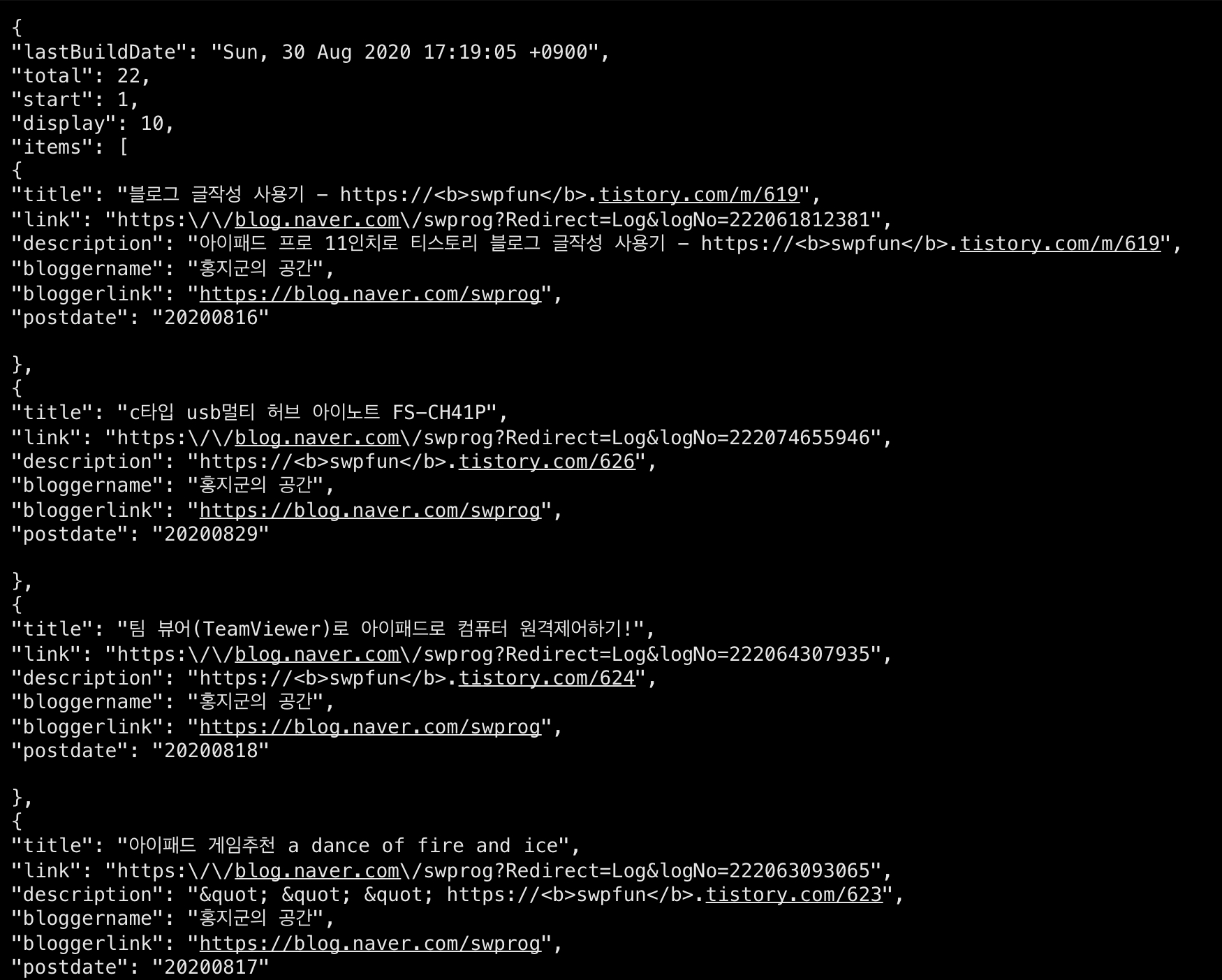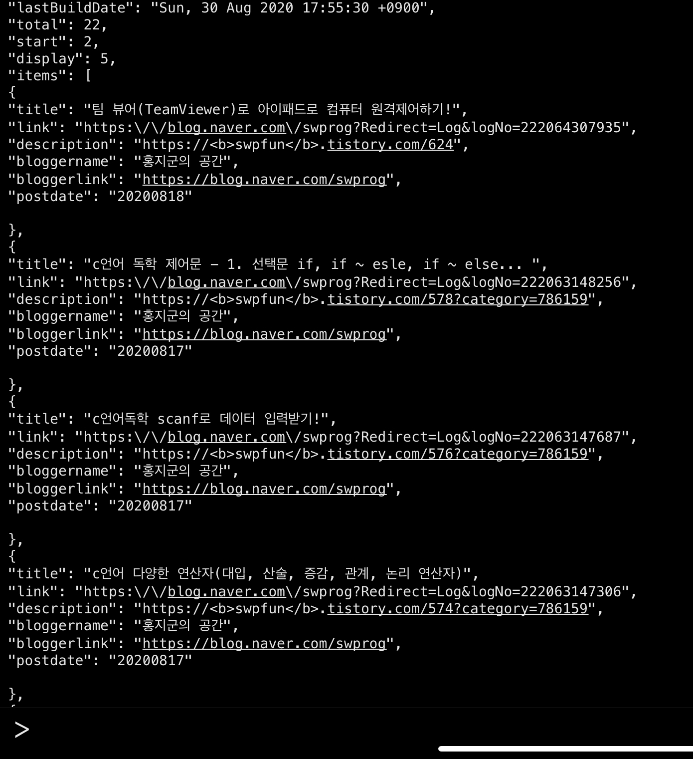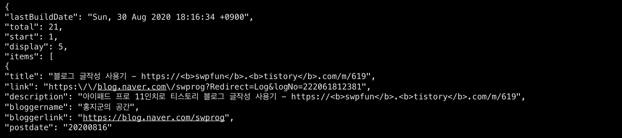 결과에 보면 2020년 8월 29일에 작성된 글이 가장 1순위로 검색이 되고 다음은 2020년 8월 18일에 작성된 글이 2번째로 보여집니다. 모든 결과는 display를 5로 지정해서 5개의 정보만을 보여줍니다.