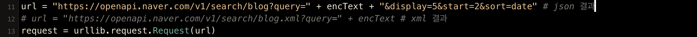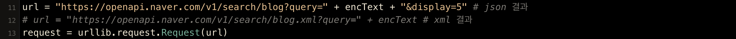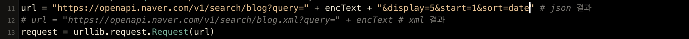 # url = "https://openapi.naver.com/v1/search/blog.xml?query=" + encText # xml 결과