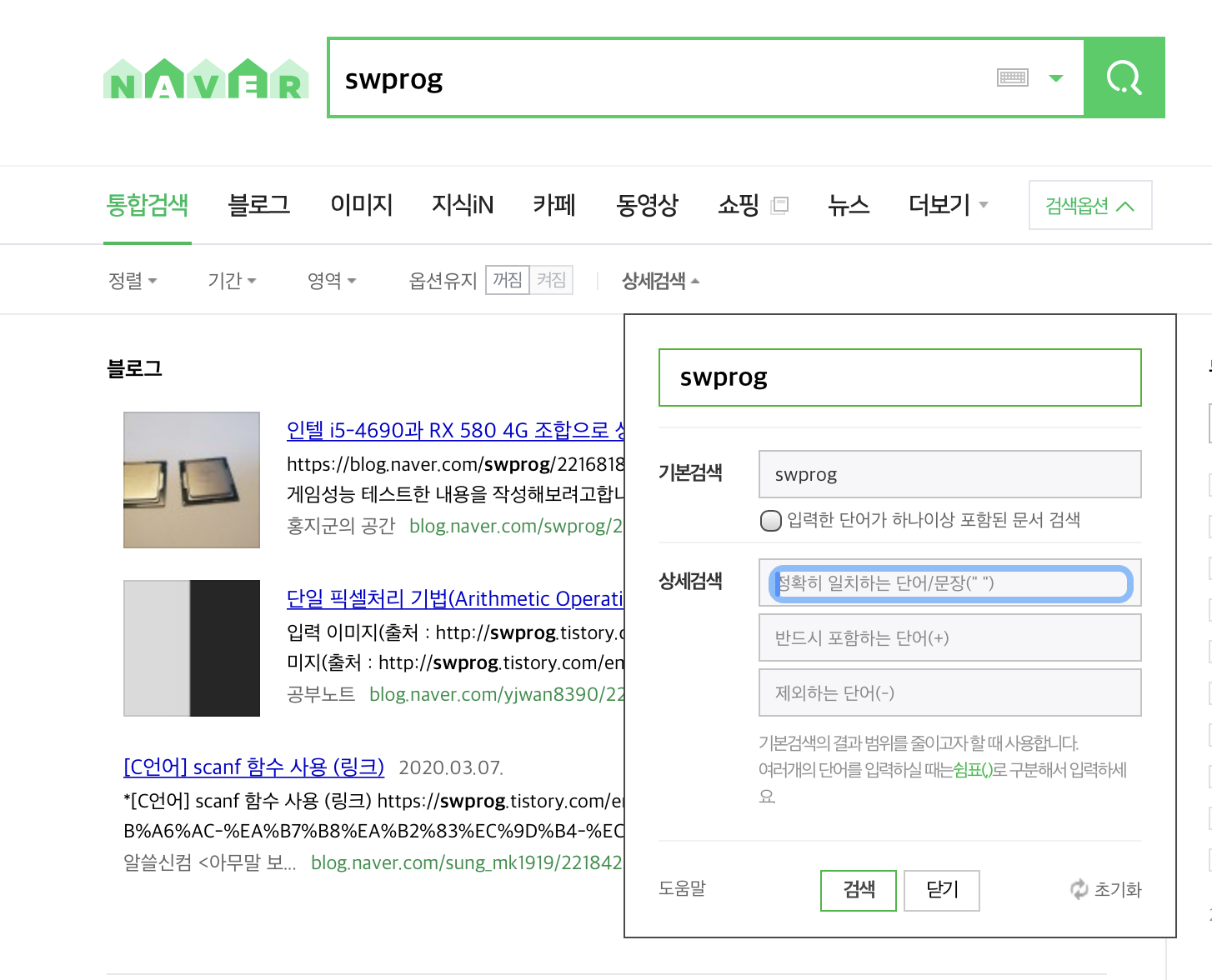 네이버에서 검색할때 조금더 검색 결과의 범위를 줄이기 위해서 상세검색 기능을 사용하곤 합니다. blog api를 활용할때는 어떻게 사용해야되는지 한번 알아보겠습니다. 상세검색 기능들을 보면 "정확히 일치하는 단어/문장", "반드시 포함하는 단어", "제외하는 단어"의 상세 검색 옵션이 있습니다.