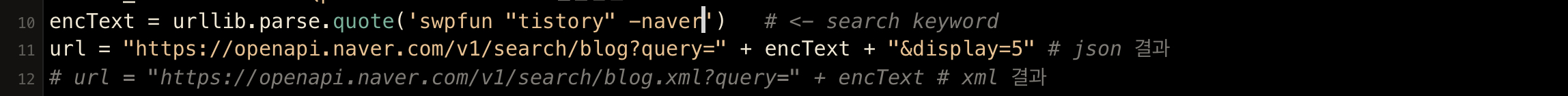 url = "https://openapi.naver.com/v1/search/blog?query=" + encText #
