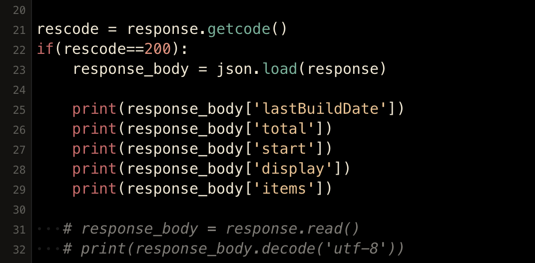 response_body = json.load(response) 이렇게 되면 json 형식의 배열로 response_body에 데이터가 대입되어 배열의 형태로서 데이터들을 추출할 수 있게 됩니다.