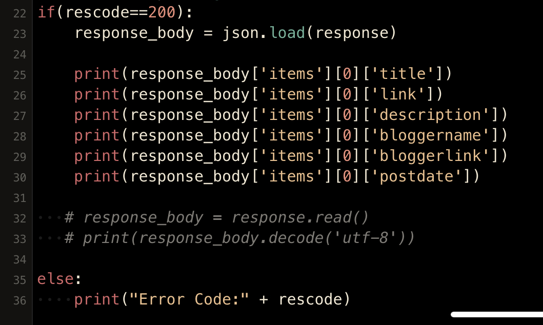 이전 글에서는 python에서 네이버 블로그 api 검색에 대해서 기본적으로 값을 받아오는 것 까지 해봤습니다. 이번에는 json으로 값을 변환하고 변환된 json 배열값을 하나하나 뽑아서 출력해보는 시간을 가져보겠습니다