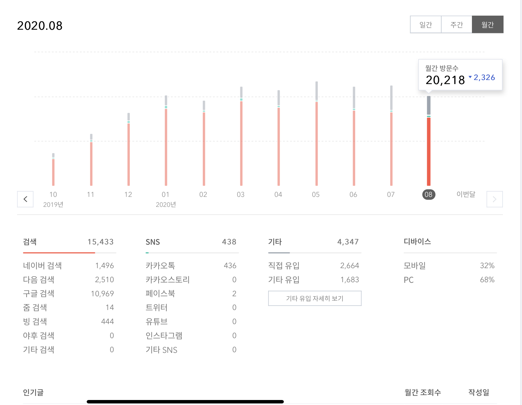 2020년 8월 한달간의 홍지군 블로그의 총 방문자 수는 20,218명의 방문자수를 기록했습니다!! 2020년 1월의 월간 방문자수와 큰 차이가 없는 방문자 수.. 3월 ~ 7월달 까지의 방문자 수 보다 많이 줄어들었네요.. 분명 글은 1월과 2월에 비해서 작성된 글이 많을 텐데.. 그래도 노출되어지는 글에서만 방문자가 발생하는것이니 그동안 유입될 만한 유익한 글을 작성하지 못했다고 생각되네요.