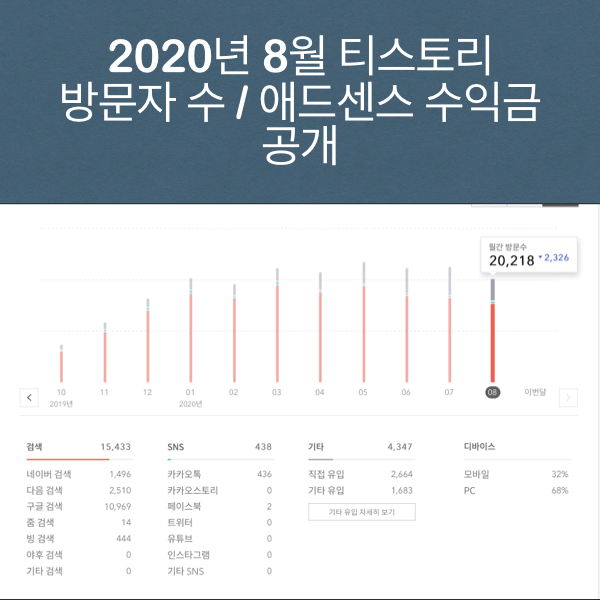 티스토리 블로그 2020년 8월 방문자수 애드센스 수익금 공개