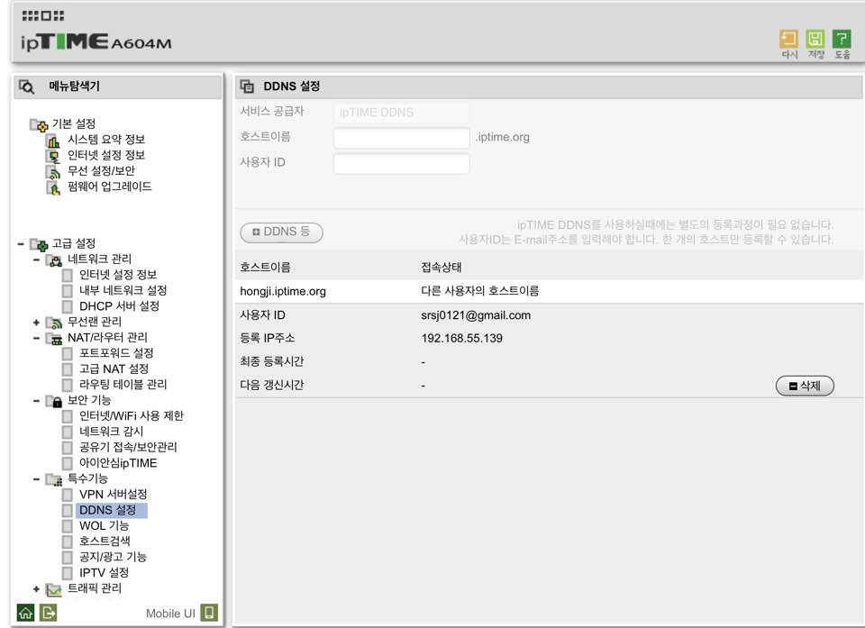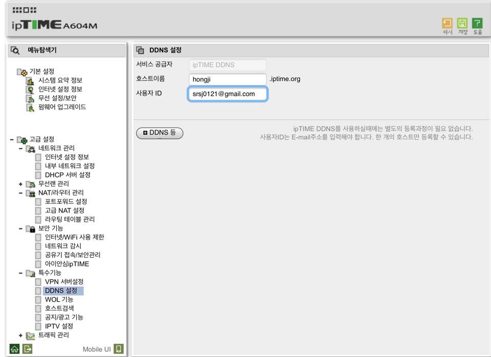 ipTime의 DDNS 설정 방법은 공유기의 관리페이지 왼쪽 메뉴탐색이 항목에서 "특수기능" -> "DDNS설정"에 들어가 사용할 호스트 이름(외부에서 접속하게될 주소 앞부분) 과 사용자 ID("이메일 형식")를 설정하고 DDNS를 등록해주시면 됩니다.