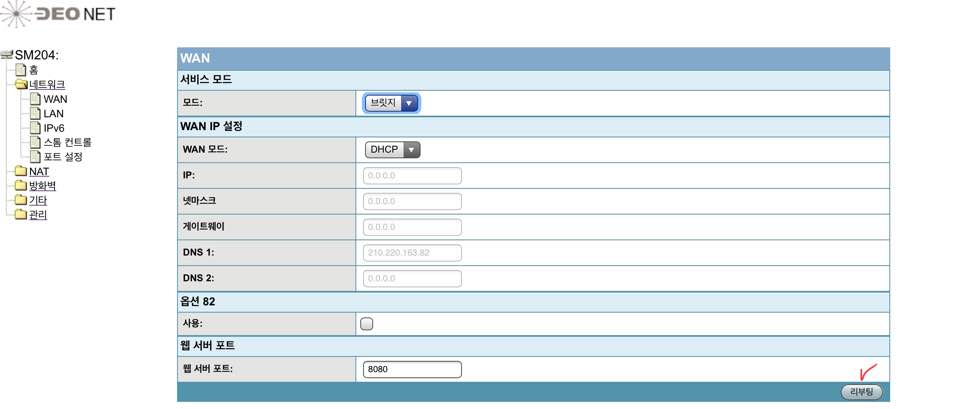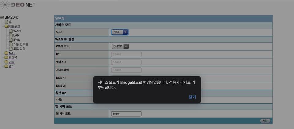 Iptime 공유기를 사용중이라면 SM204모델의 WAN 서비스 모드를 NAT에서 브릿지 모드로 변경을 통해서 Iptime에서 외부 주소를 받아오고 iptime의 DDNS 서비스를 이용할 수 있게됩니다.
