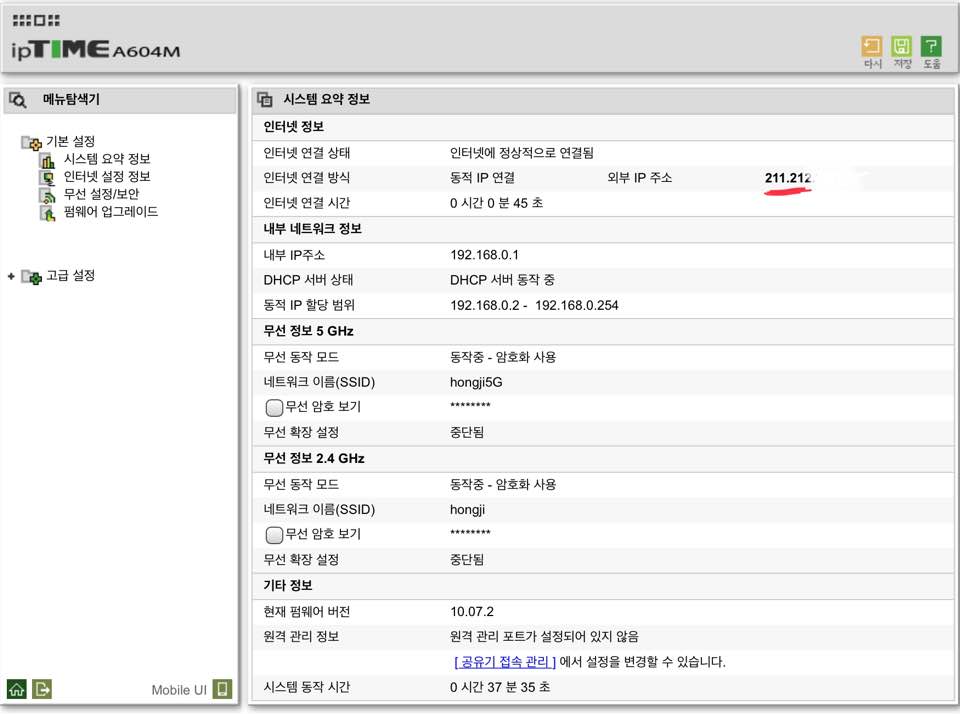 다음으로 iptiem 공유기의 관리모드(192.168.0.1)에 들어가서 "시스템 요약 정보"에서 외부 IP 주소가 192.168.55.??이 아닌 211 이나 다른 주소가 표시된다면 SM204허브의 WAN서비스 모드가 브릿지 모드로 정상적으로 적용된 것 입니다. 만약 192.168.55.??으로 표신된다면 SM204 WAN 서비스 모드를 확인해보시기 바랍니다.