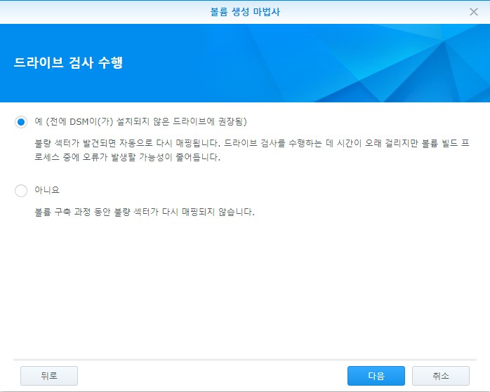 RAID를 구성할 하드디스크를 선택하고 경고를 확인해줍니다. 다음으로 드라이브 검사 수행에서 예)를 선택하거나 아니요를 선택하시면 되는데 가능하면 "예" 선택으로 오류가 발생할 가능성을 줄여주는 것이 좋습니다.