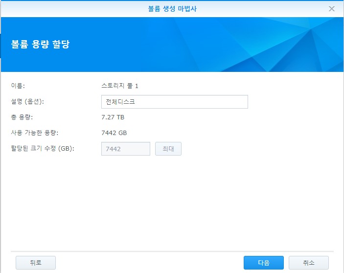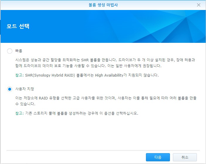 볼륨생성은 "빠름", "사용자 지정" 두가지를 선택할 수 있는데 빠름 선택시 SHR(Synology Hybrid RAID)로 RAID가 구성되어 처음 사용하는 유저에게 추천하는 생성모드입니다. 저는 RAID0으로 4TB * 2개를 8TB로 사용할 예정이라 사용자 지정으로 선택했습니다.
