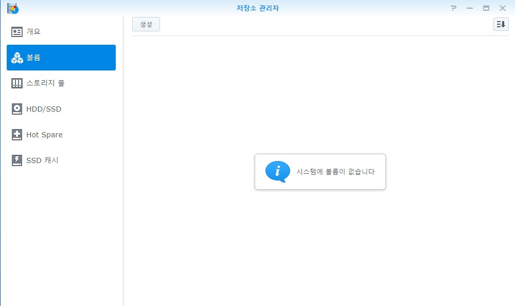 DSM에서 볼륨 생성은 DSM바탕화면의 오른쪽 상단에 돋보기 모양에서 "저장소 관리자"를 검색해서 들어올 수 있습니다. 저장소 관리자 -> "볼륨" -> "생성" 클릭!
