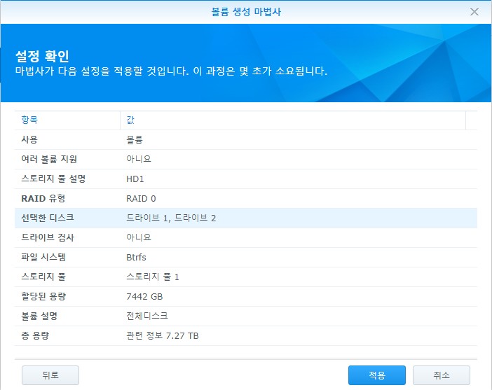 다음으로는 볼륨 할당인데 RAID0이라 설정할 건 없고 그냥 설정확인 후 적용!!