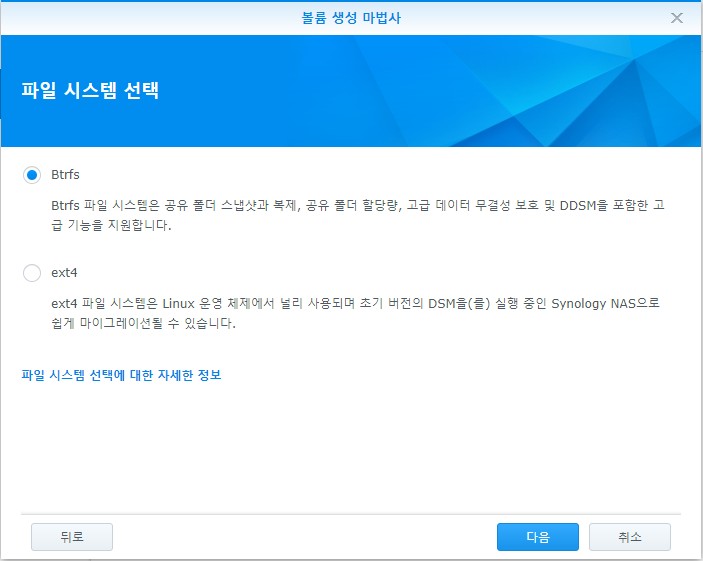다음으로는 파일 시스템 선택을 해야하는데 Btrfs와 ext4 2가지 중 한가지를 선택 할 수 있습니다. ext4는 조금더 리눅스에 가깝고 다른 파일 시스템보다 CPU의 사용율이 낮지만 시놀로지의 모든 기능들을 활용하기 위해서는 ext4보다는 "Btrfs" 파일 시스템을 사용하시는 것이 좋다고 합니다.