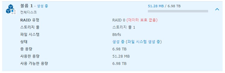 적용을 누르면 볼륨에 볼륨1이 생성되고 "생성 중" 상태에서 생각보다 빠르게 "정상"으로 변경되었습니다. 사용 중인 용량이 없는 비어있는 하드디스크라 그런가.... 4TB 2개인데 총 사용가능한 용량은 7TB정도 되네요 ㅎㅎ