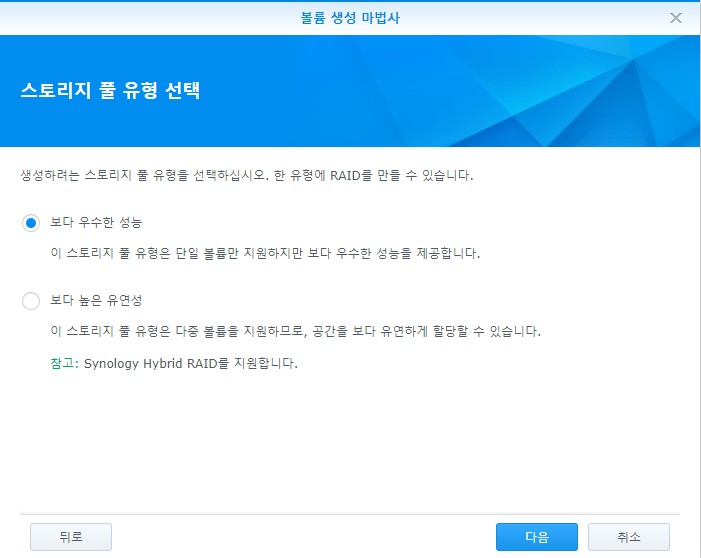 "보다 높은 유연성"스토리지 풀 속성에서 RAID0, RAID1, JBOD, 기본, SHR 중 선택할 수 있습니다.