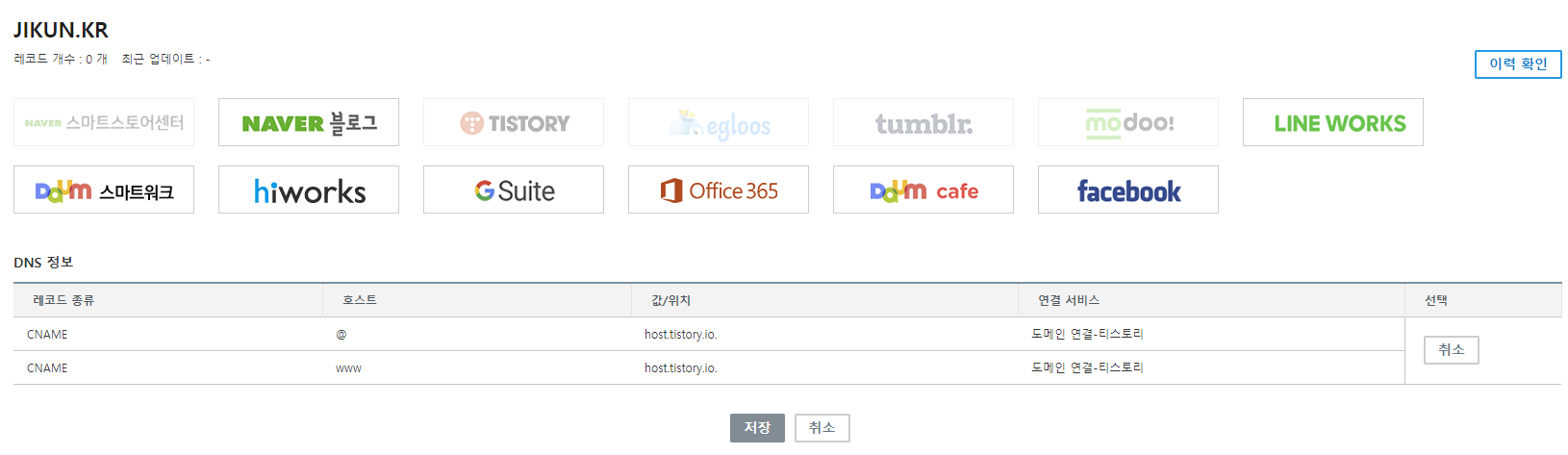 "도메인 연결"에서 "티스토리 로고"를 클릭해줍니다. 그러면 자동으로 DNS 정보에 CNAME 레코드로 @와 www가 추가된 것을 확인하고 "저장" 해줍니다.