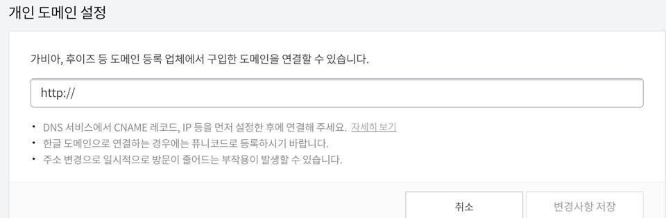 블로그관리-> 관리 -> 블로그 메뉴에서 중간쯤 위치한 "개인 도메인 설정"에서 "도메인 연결하기"를 누르고 가비아에서 설정한 도메인 주소를 입력해줍니다. 저는 http://www.jikun.kr로입력 후 "변경사항 저장"을 했습니다.