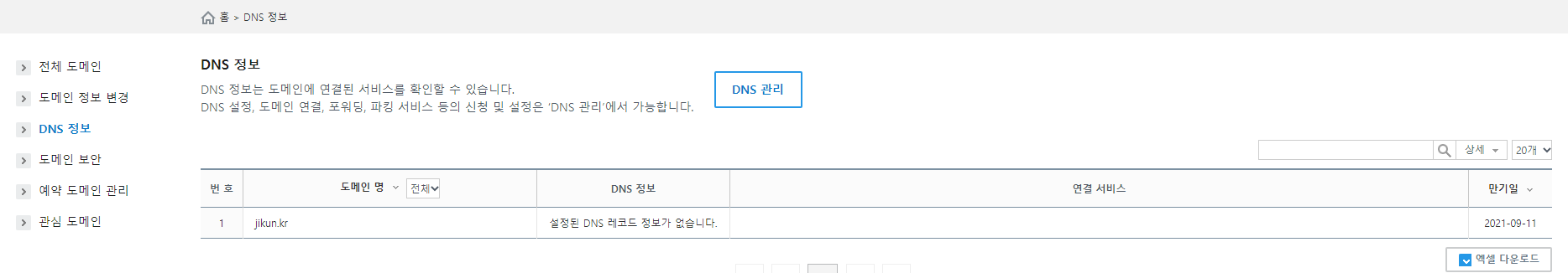 도메인 관리툴에 들어왔다면 왼쪽 메뉴의 "DNS 정보"를 클릭하고 DNS 정보 상단의 파란색의 "DNS 관리"버튼을 눌러줍니다.