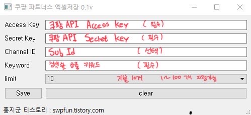 쿠팡 Access Key와 Secret Key를 입력하고 검색할 상품의 키워드를 입력! save를 누르면 엑셀파일로 저장이 되어지는 프로그램입니다. limit은 추출할 상품의 개수로 기본 10개의 목록을 뽑아오고 1~100 중 선택해서 원하는 개수 만큼 API에서 상품을 검색해 엑셀 파일로 저장할 수 있게됩니다.